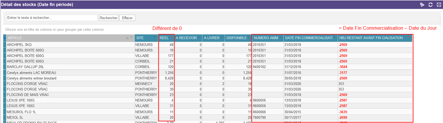 ⇒ il est maintenant possible de sortir un tableau qui permettra par exemple de mettre en valeur les articles ayant du stock et avec le Nbre de Jour restant avant le FIN de COMMERCIALISATION faible et ainsi mieux gérer les stocks.