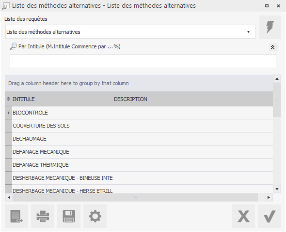 Le paramétrage des méthodes alternatives permet de modifier, augmenter ou diminuer la liste des méthodes alternatives proposées lors de la saisie des produits.Sélection de la maintenance des Méthodes Alternatives