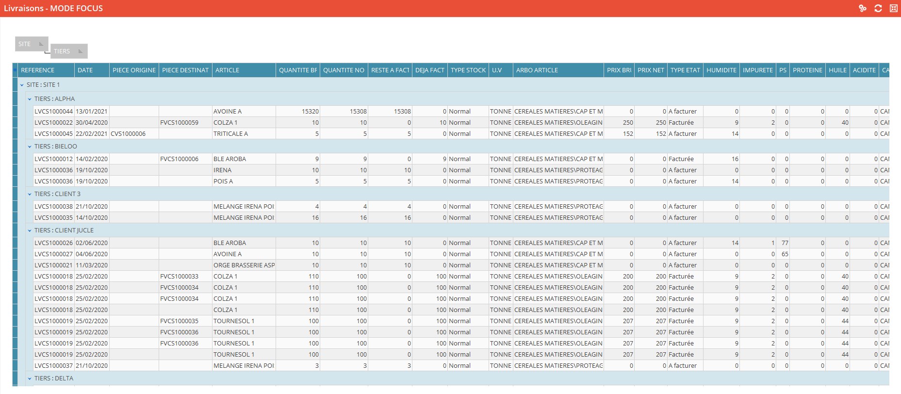 Possibilité de visualiser les caractéristiques (Humidité, Impureté, PS, Protéine, Huile, Acidité) renseignées dans les pièces de livraison et de faire des moyennes par période, par exemple (mise en place d'un groupe du pied et d'une formule dans le pied)
