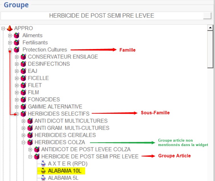 - ATTENTION : Seules les familles, sous familles et groupe article directement au dessus de l'article sont présentées, les groupes articles intermédiaires ne sont pas visibles :
