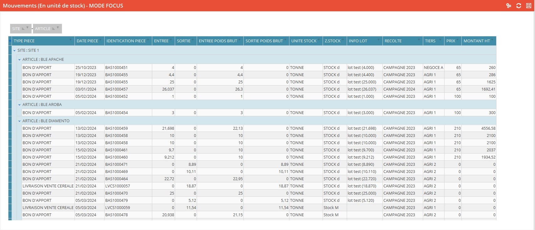 Module CEREALE -> Stocks-> Mouvements (en unité de stock)