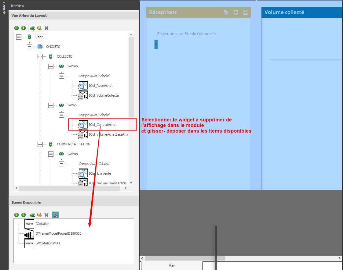 3- Déplacer le widget à supprimer vers les items disponibles par un glisser-déposer :