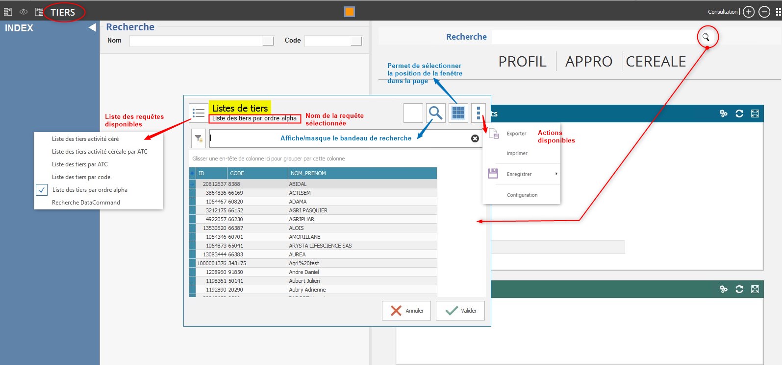 Présence, en entête des modules Tiers et Articles, d'un bandeau de recherche qui présente la requête comme une widget de grille et permet ainsi des filtres simples.
