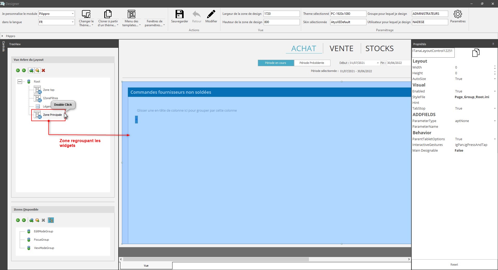 2- Double-cliquer sur la zone des modules pour accéder aux différents onglets/widgets :