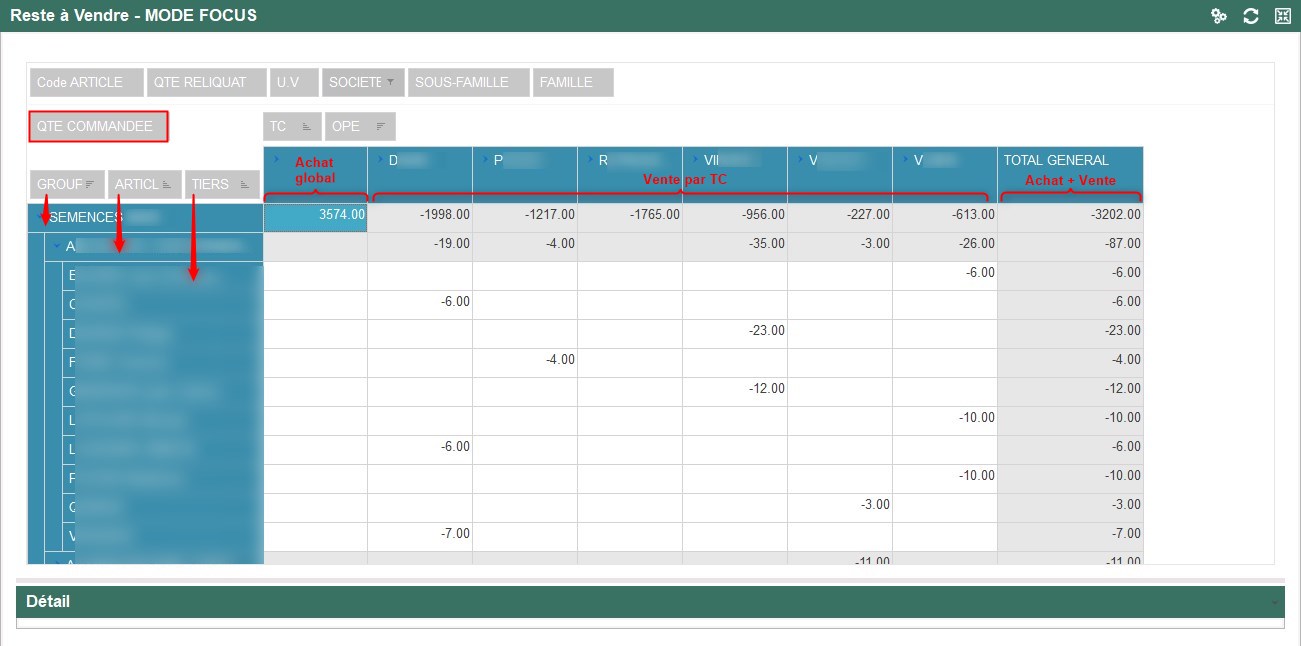 - Ce widget pivot permet une vue multidimensionnelle des quantités commandées (Achat et Vente), par Groupes articles/Articles, etc… et par ATC. Les données sont purement informatives et n'offre pas de possibilité d'interaction vers Atys.