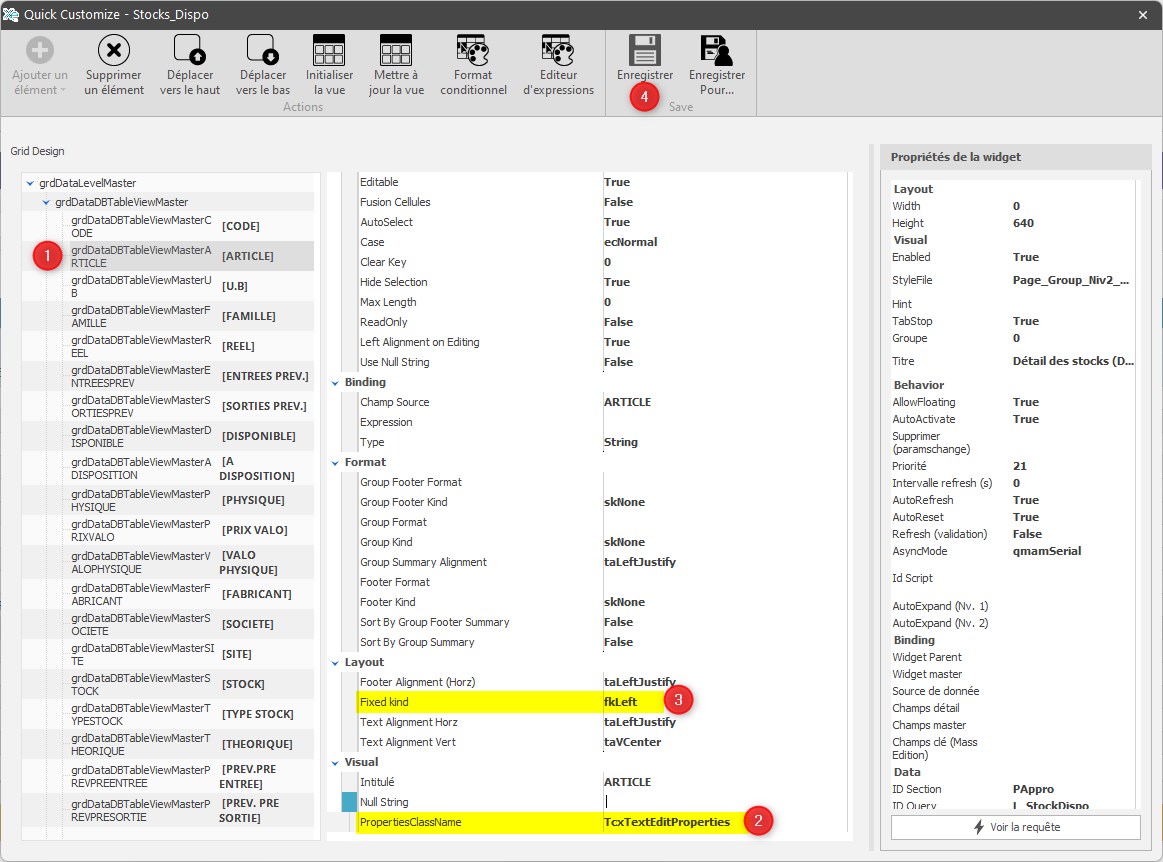 - Cliquer sur grDataDBTTableViewMaster[Nom colonne] afin d'accéder au tableau de bord du paramétrage de la colonne.